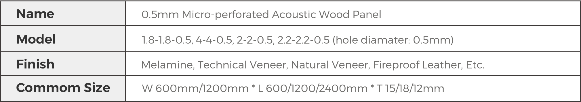 تُصنّع ألواح الخشب الصوتية الدقيقة الثقوب من ألواح الألياف متوسطة الكثافة (MDF)، حيث تحتوي الجهة الأمامية على ثقوب دقيقة والجهة الخلفية على فتحات أكبر لتحسين معامل الامتصاص الصوتي للألواح. تمتاز هذه الألواح بقدرتها العالية على امتصاص الترددات المتوسطة والمنخفضة بشكل انتقائي، مما يمنحها أداءً صوتيًا متميزًا. وعند ملء التجويف خلف الهيكل الماص للصوت بكمية مناسبة من مواد الديكور الخاصة بالجدران أو الأسقف، يتحسن تأثير الامتصاص الصوتي بشكل إضافي.