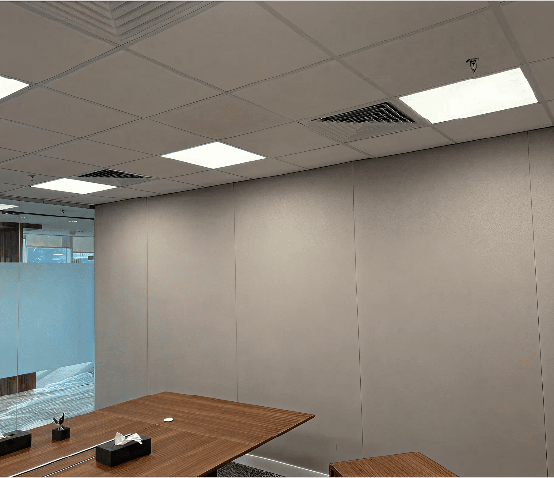 يشمل نطاق العمل توريد وتركيب أنظمة جدران وأسقف صوتية عالية الأداء لعزل غرف الاجتماعات بفعالية، مما يحدّ من انتقال الصوت ويضمن الخصوصية التامة. كما تم تطبيق الألواح القماشية الصوتية بطريقة مدروسة للتحكم في الارتداد الصوتي وتحسين وضوح الكلام، مما يخلق بيئة صوتية متوازنة وسرّية ومريحة.
