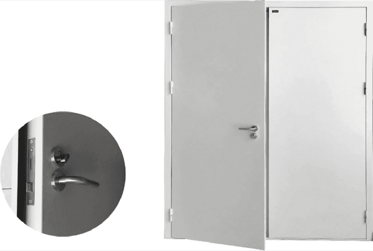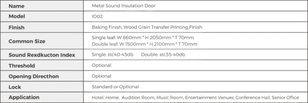 Metal sound insulation door is made of galvanized steel plain sheet, fled with damping sound insulation wool and any other insulation materials, with magnetic control rubber Seal strip. It include design with threshold and without threshold. Without threshold design adopt liftable bottom seal strip, reduce the sound leak.