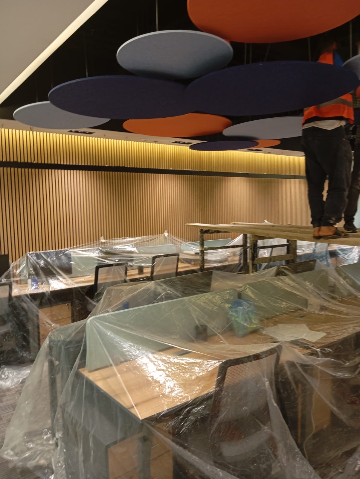 The scope of work included providing lightweight, durable, and visually appealing PET baffles designed to improve acoustic performance while complementing the office’s modern interior design