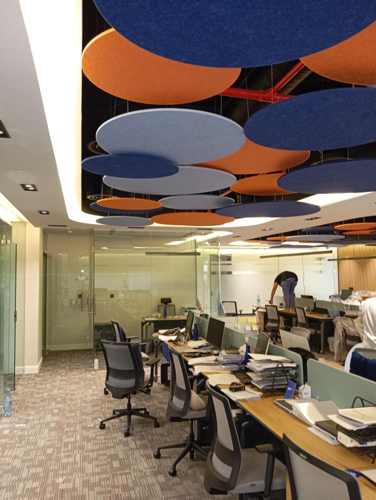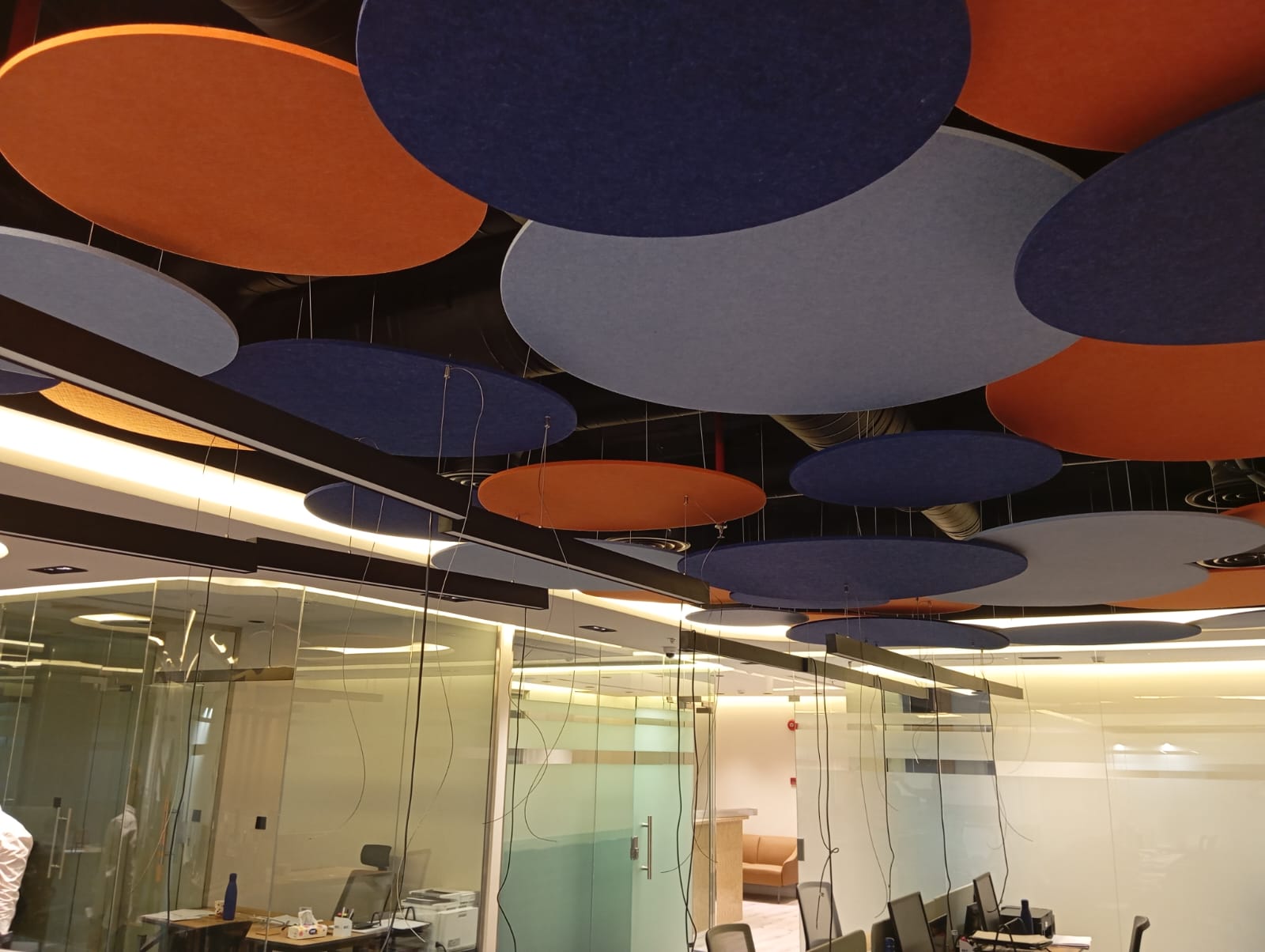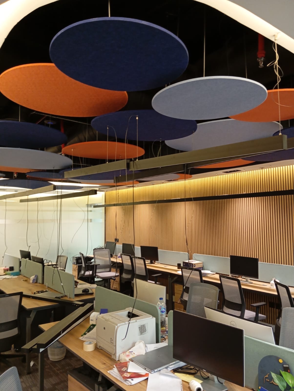 The acoustic treatment for BEC offices involved the supply and installation of PET acoustic circular baffles on the ceiling to enhance sound absorption and reduce noise levels in the workspace.