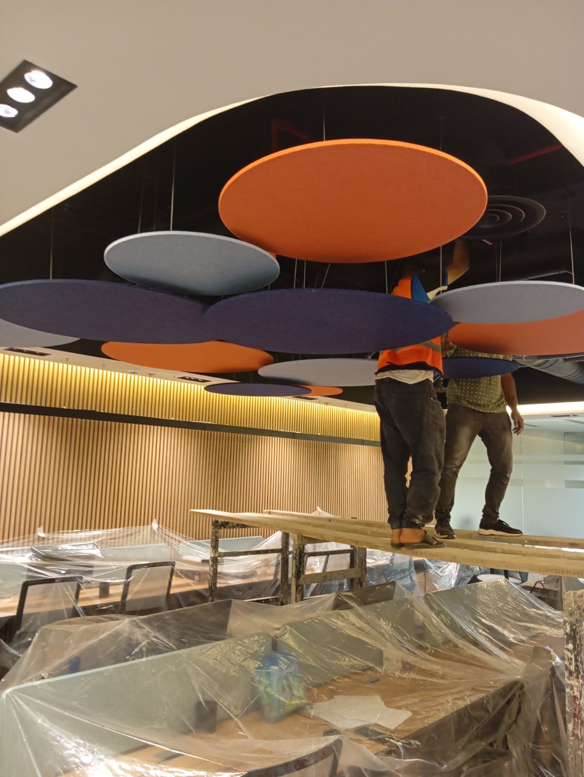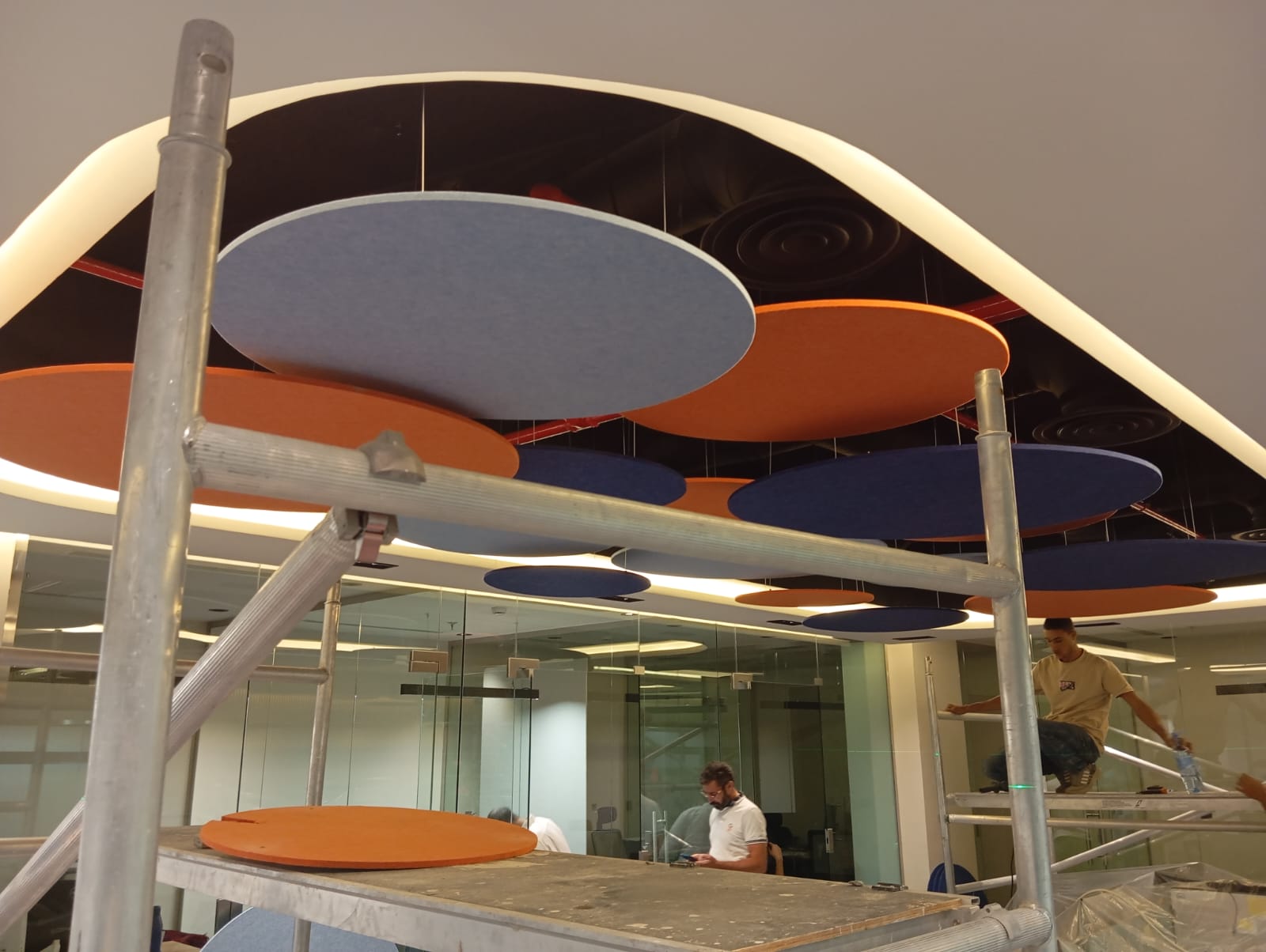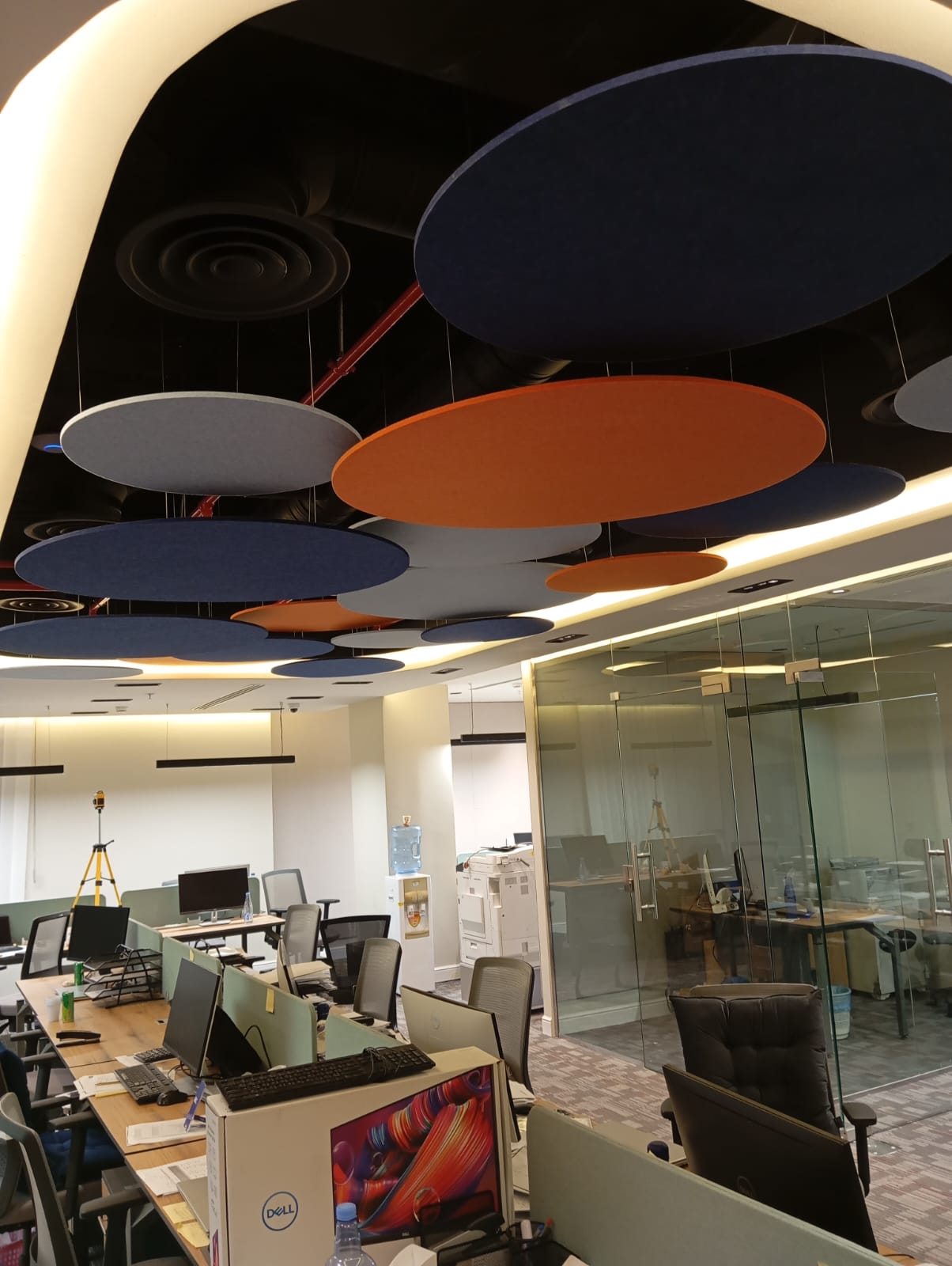 The acoustic treatment for BEC offices involved the supply and installation of PET acoustic circular baffles on the ceiling to enhance sound absorption and reduce noise levels in the workspace.
