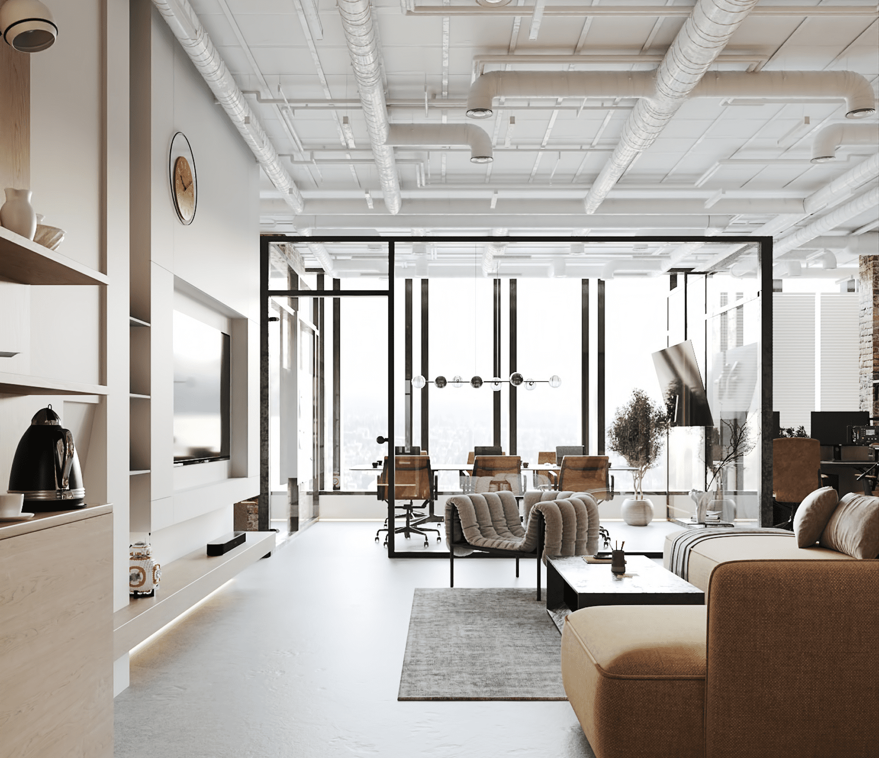 The office lounge aims to provide a comfortable area for relaxation and informal meetings, with cohesive furnishings and décor. The office spaces are designed for efficiency, incorporating adequate lighting and ventilation.