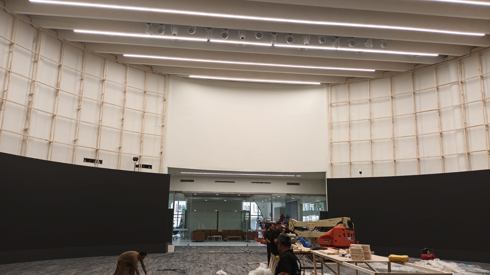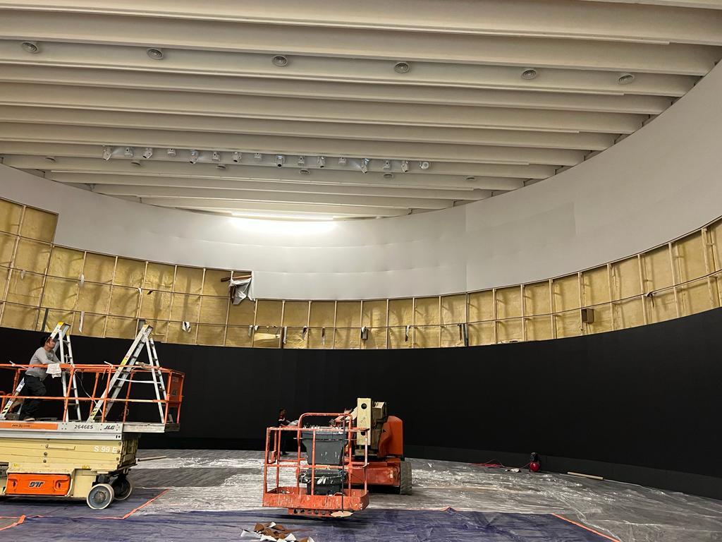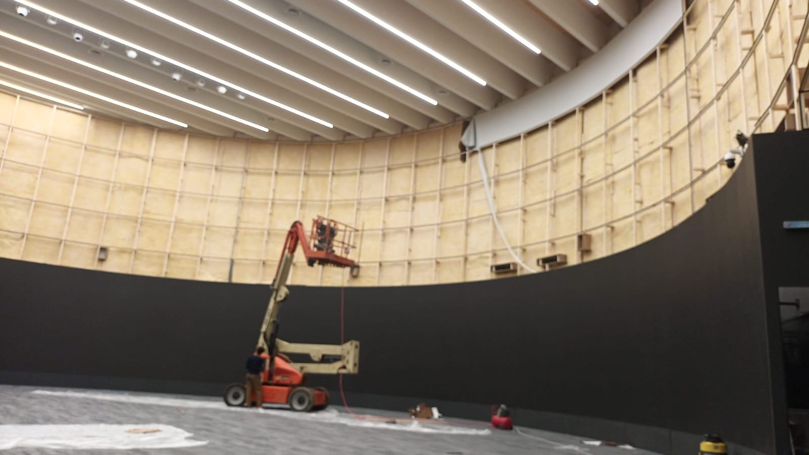 The acoustic treatment of a large circular hall involved the use of an Acoustic Fabric Stretch System installed on the walls to enhance sound absorption and control reverberation, ensuring optimal auditory clarity and comfort.