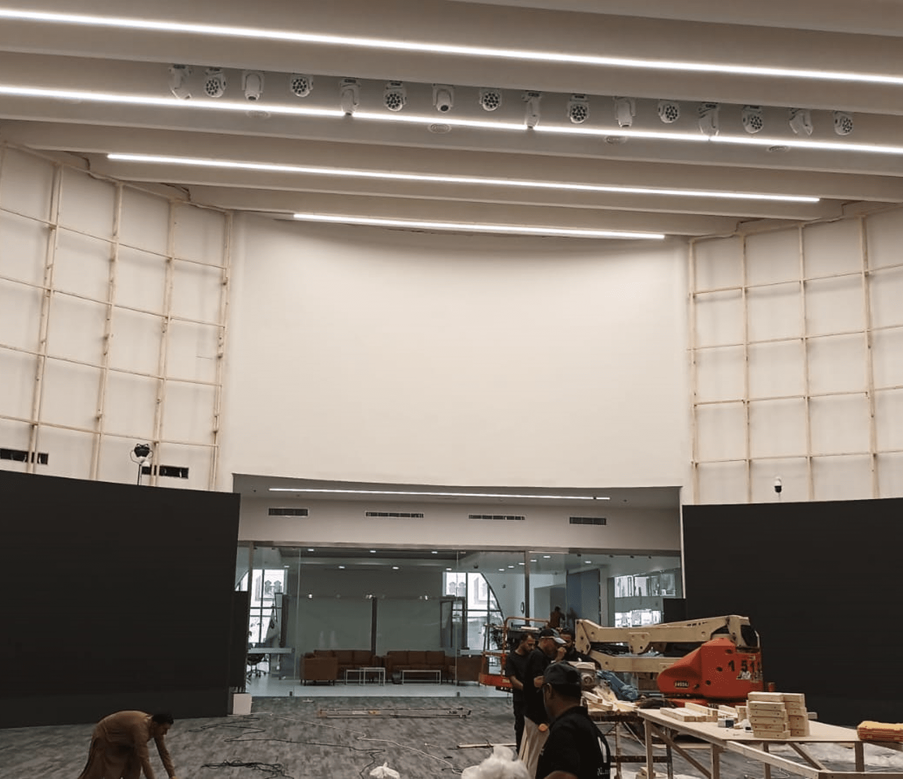 The scope of work included comprehensive acoustic consultancy to analyze the hall’s unique acoustic challenges and provide tailored solutions. High-quality fabric stretch panels were supplied and professionally installed, ensuring a seamless finish that complemented the hall’s design.